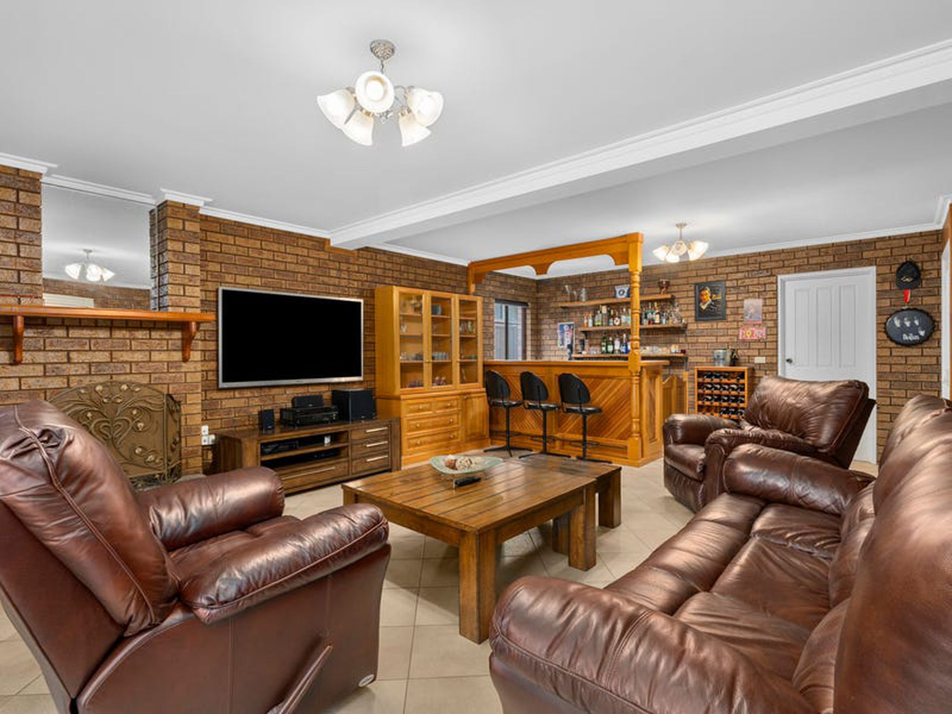 The lower level comprises of large rumpus room complete with a built in timber bar and open fire place and central heating throughout.