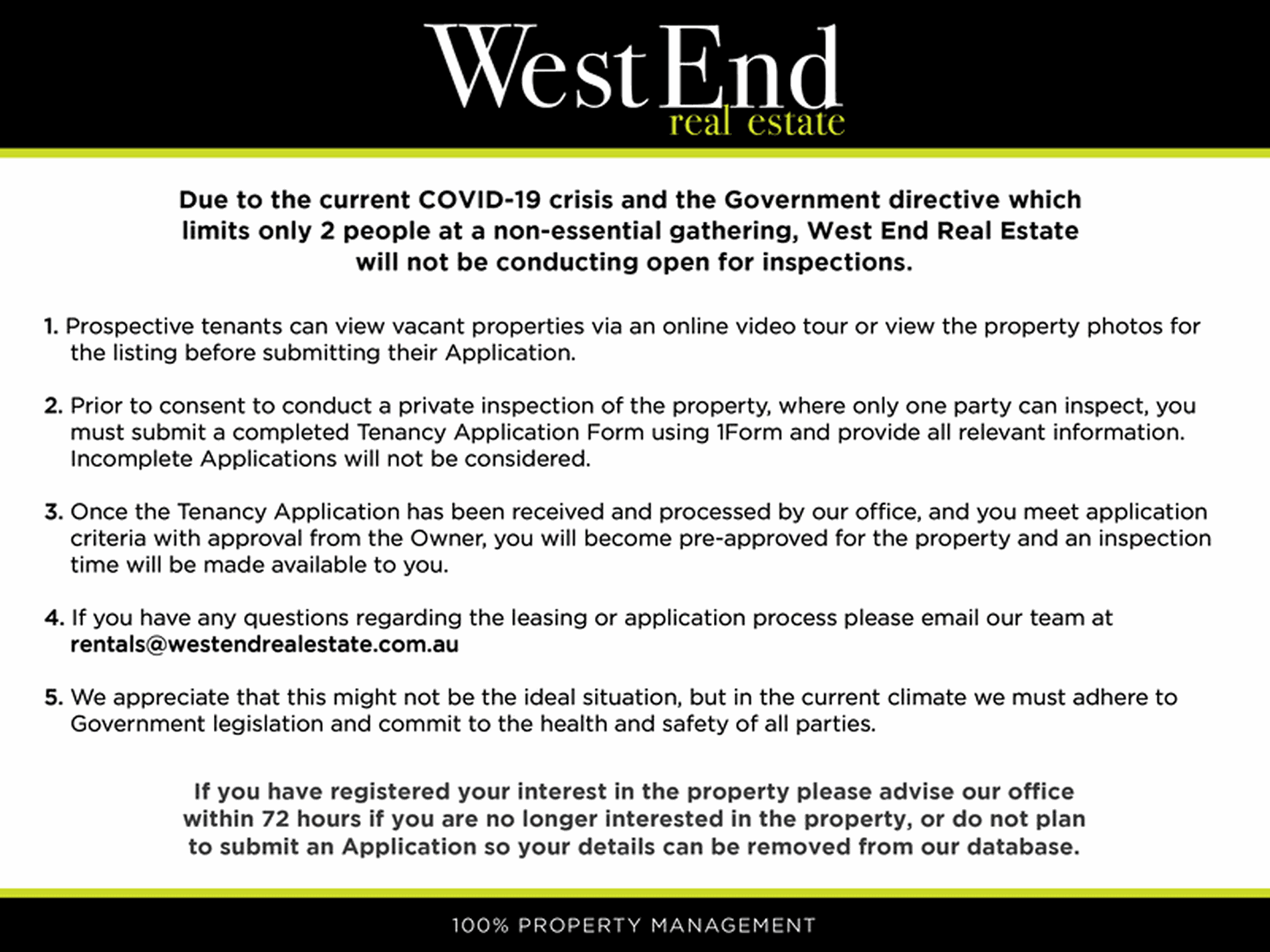 • Due to the current COVID-19 pandemic under Stage 3 Restrictions, West End Real Estate will not be conducting open for inspections of available rental properties.