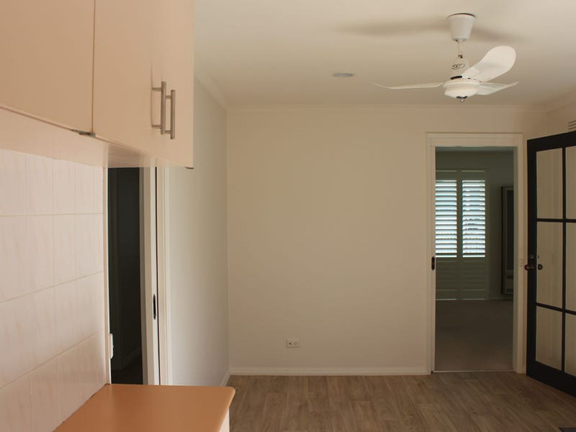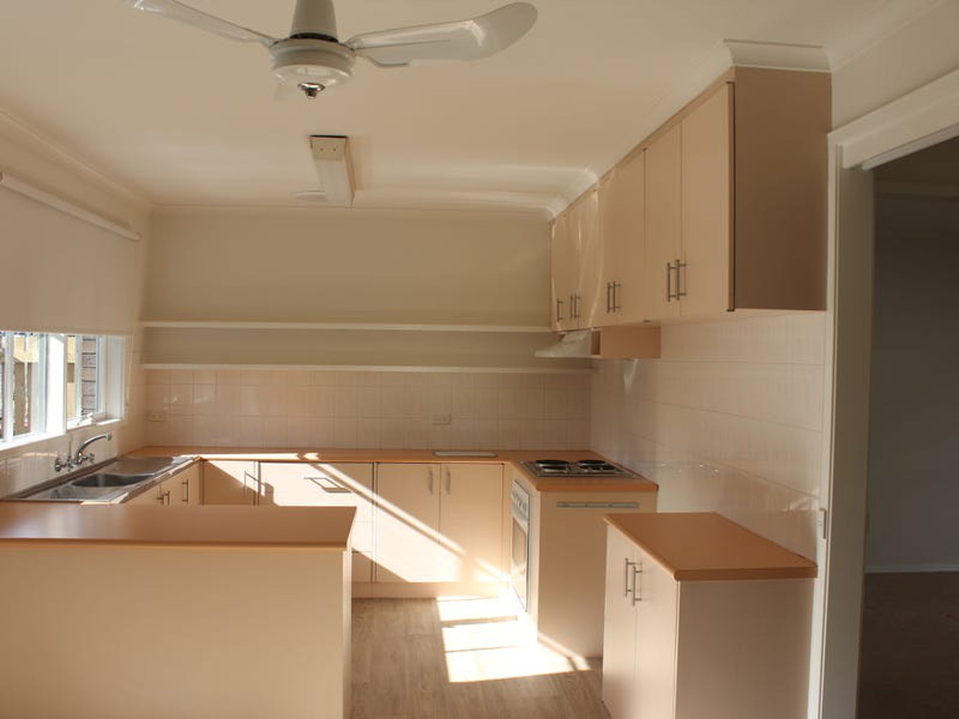 * Contemporary kitchen with electric cooking appliances, dishwasher, plus reverse cycle split system in the meals area