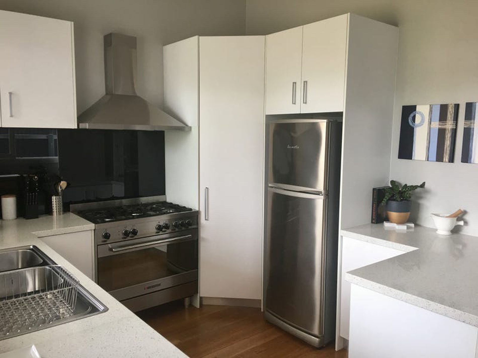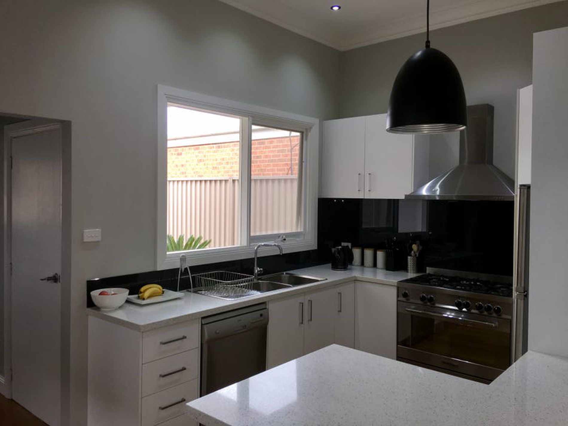 * Contemporary kitchen featuring stone bench tops, stainless steel appliances; 5 burner gas upright stove/oven plus a dishwasher