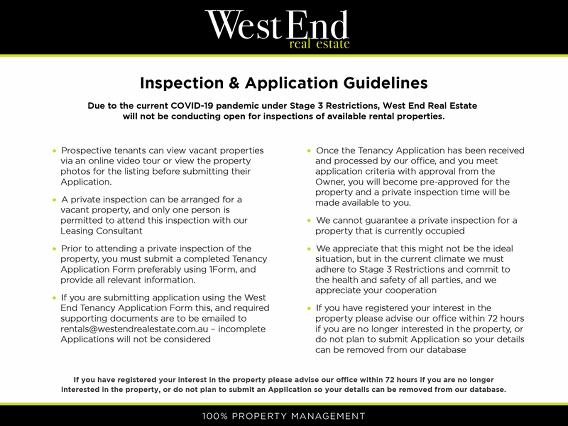• Due to the current COVID-19 pandemic under Stage 3 Restrictions, West End Real Estate will not be conducting open for inspections of available rental properties.