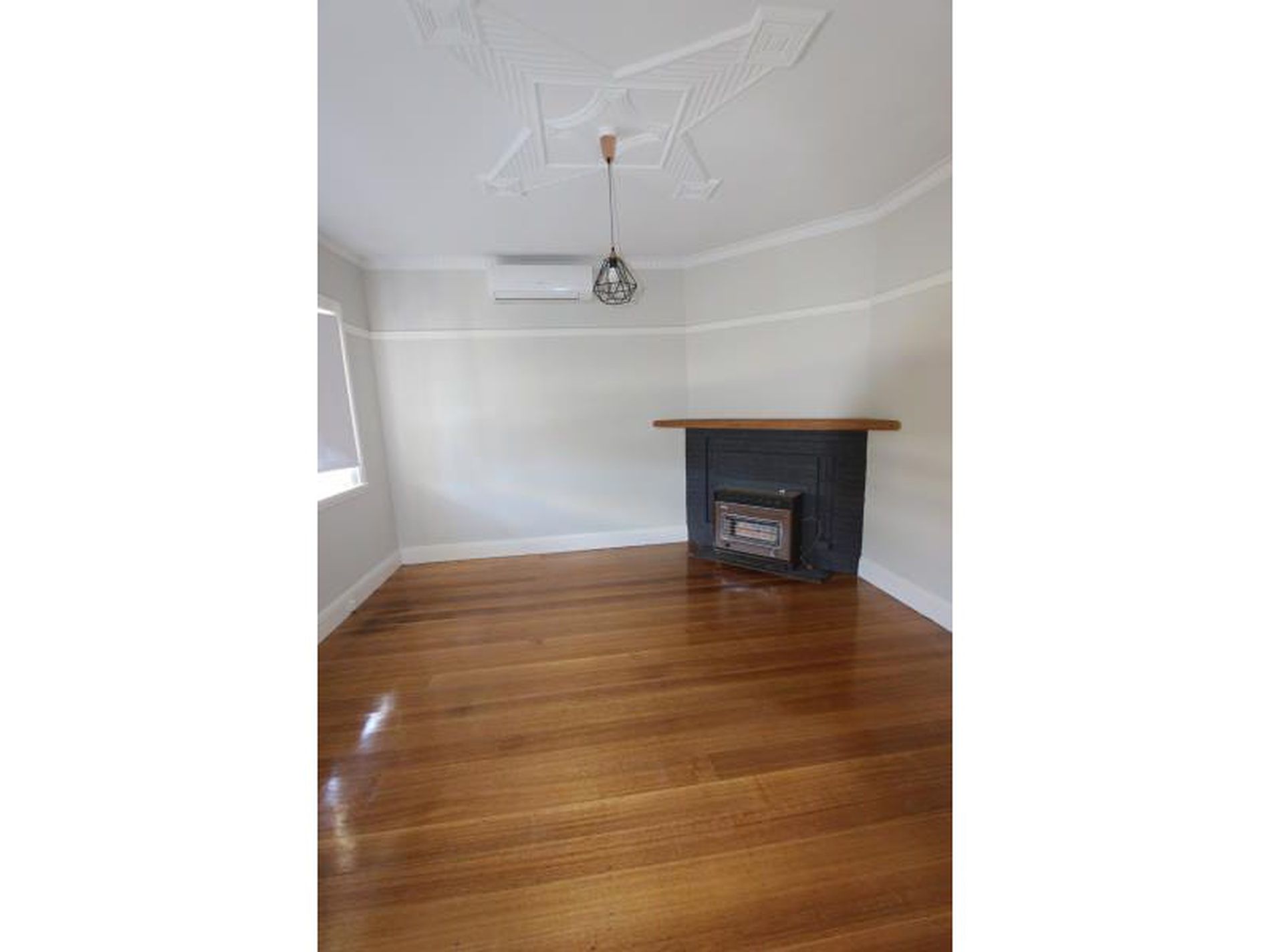 * Lounge with newly polished floorboards and gas heater