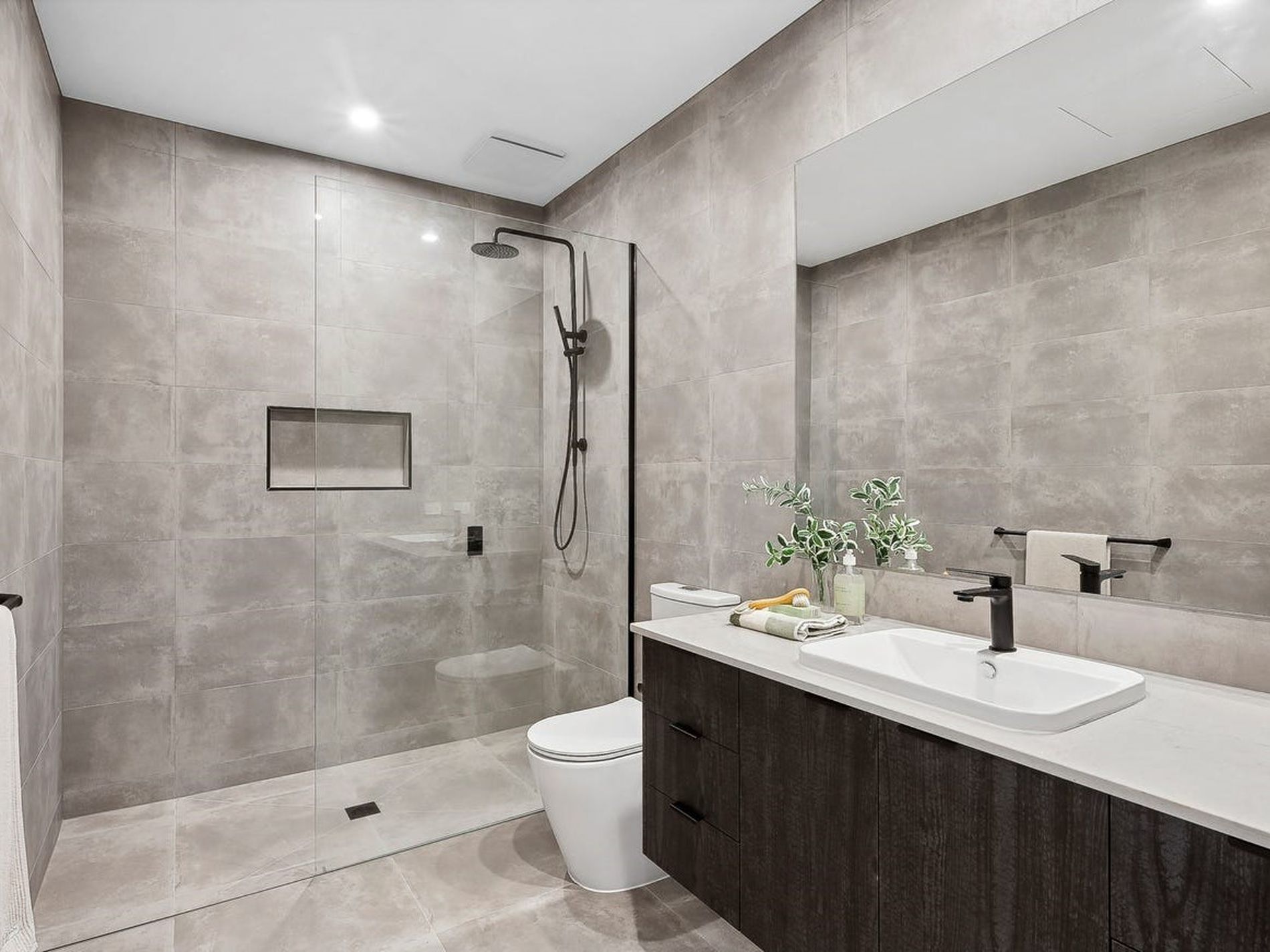 π Designer bathrooms with floor-to-ceiling tiles and sleek modern fixtures