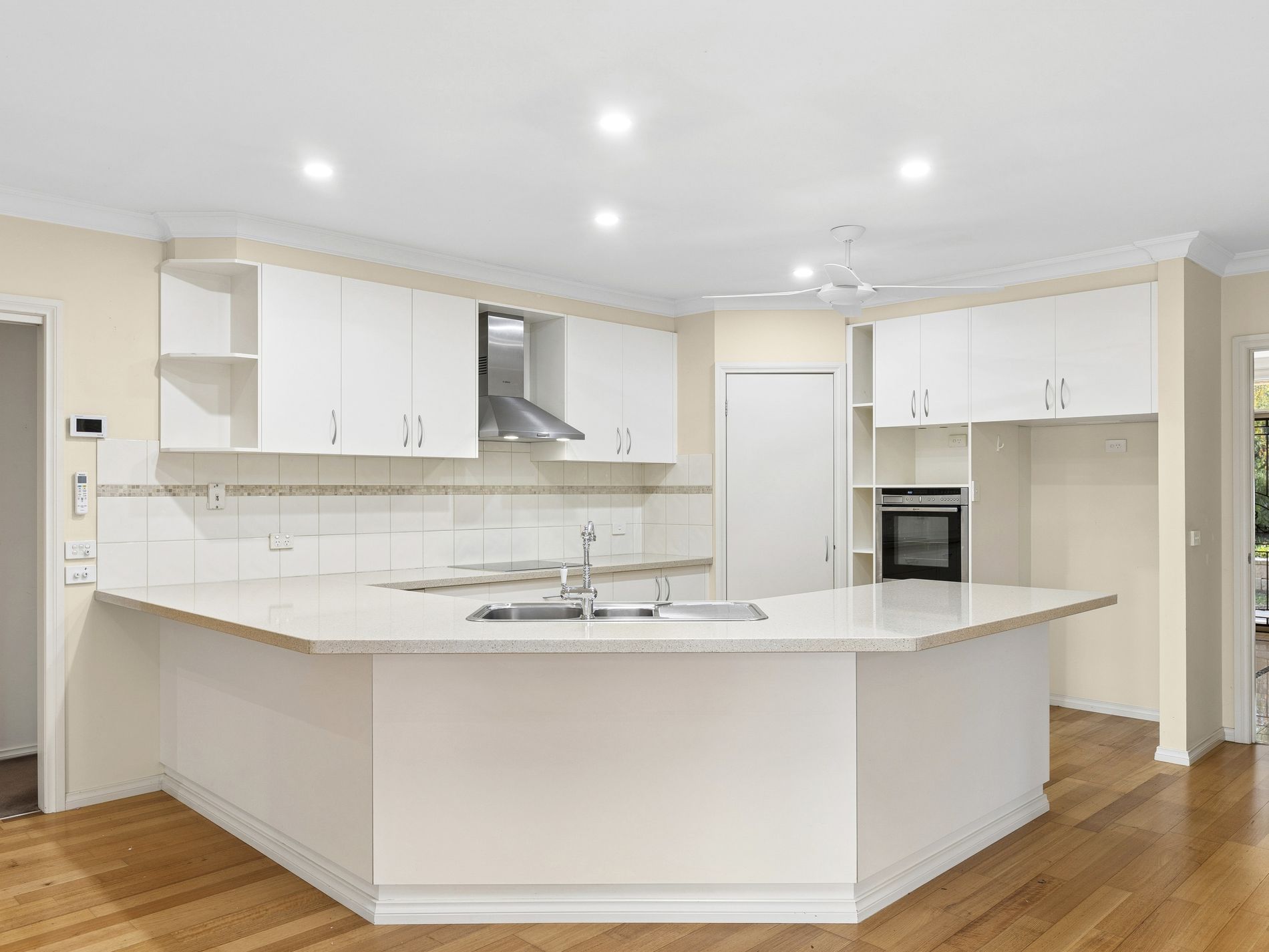 The heart of the home is the modern kitchen, complete with stone benchtops and dishwasher, flowing seamlessly into the open-plan living and dining area with polished timber floors and split system air conditioning.